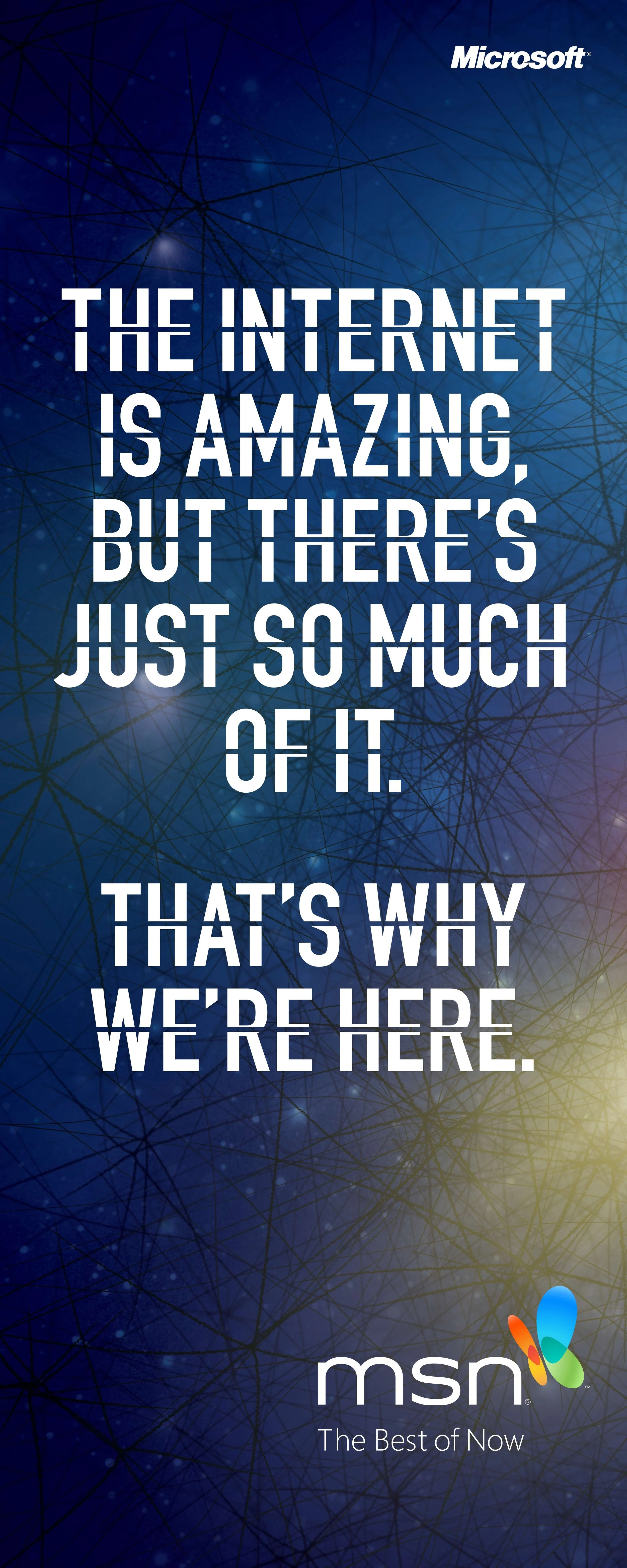 Made with design studio Tomato we visualised the enormity of the internet and MSN’s role in distilling it to the best bits. The film was voiced by the amazing Doc Brown. A bespoke typeface was created. The campaign consisted of an online film, giant floor stickers, OOH and a brand book for MSN’s internal use.